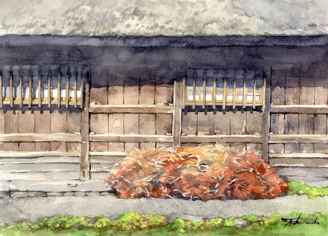 軒下 (野田村・アジア民族造形館・岩手県) 2018年10月06日 コメント数:0 コメント by suisaigafromiwate 個展の疲れが少し残っているような気がします。期間中は盛岡通い、その間の作品です。野田村のアジア民族造形館、訪れたのは二度目、前回は夕暮れ間近でした。茅葺家屋が移築してあります、資料館、工房などがありますがまだ中に入ったことはありません。 建物の一角、目を引くものがありました、剪定した枝の塊でしょう、屋根と出窓、そして手前の草、描いてみました。こんな陽の当たる場所でのんびりしたい、作者の願望です。F4ラングトン、クサカベ。 タグ :野田村アジア民族造形館岩手県 Tweet Share on Tumblr 広告 古い記事を読む コメント コメントフォーム 名前 コメント 評価する リセット リセット 顔 星 投稿する 情報を記憶